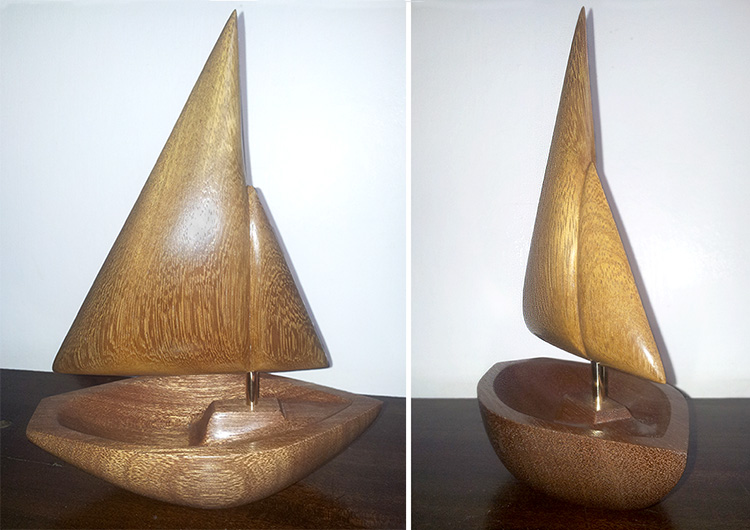 The customer wanted a sailing boat-shaped vessel for her husband to keep his car keys in. Carved from lacewood with a brass pin to support the sail.